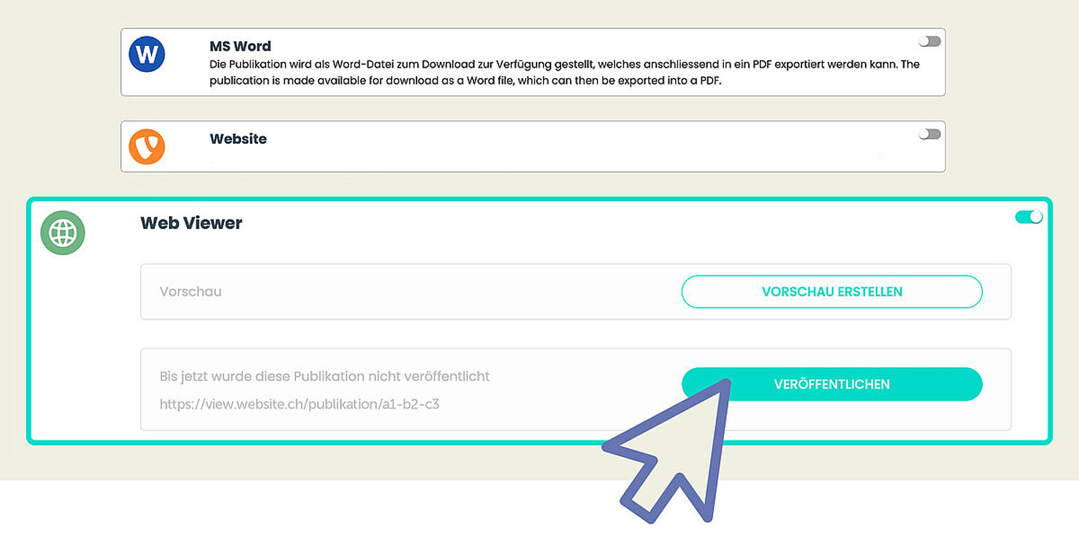 Zu den bestehenden beiden Publikationskanälen «MS-Word» und «Website» gibt es auch neu die Möglichkeit vom «Web Viewer».